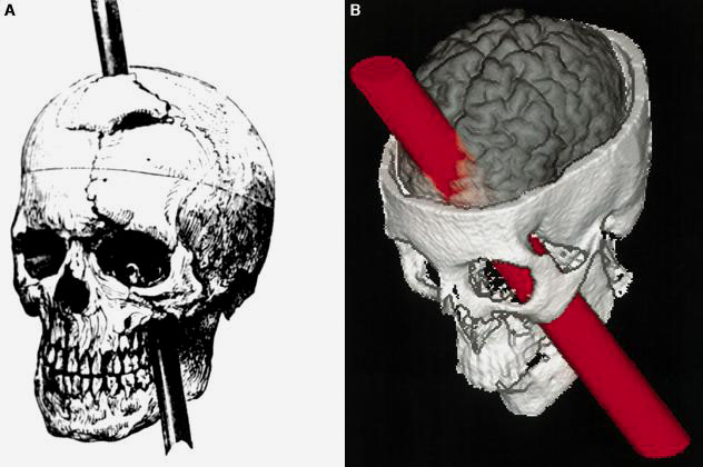 Stalowy pręt jak strzała przeszył policzek Gage'a i wyleciał u góry czaszki.