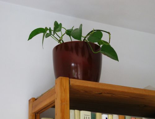 U góry, na moich półkach z książkami stoją scindapsusy. Gdy obciąłem im pnącza, jeden z kwiatków się obraził i przestał rosnąć. Ponieważ słowo "obraził" pochodzi od wyrazu "ciąć", więc nie przesadzam (tego kwiatka).